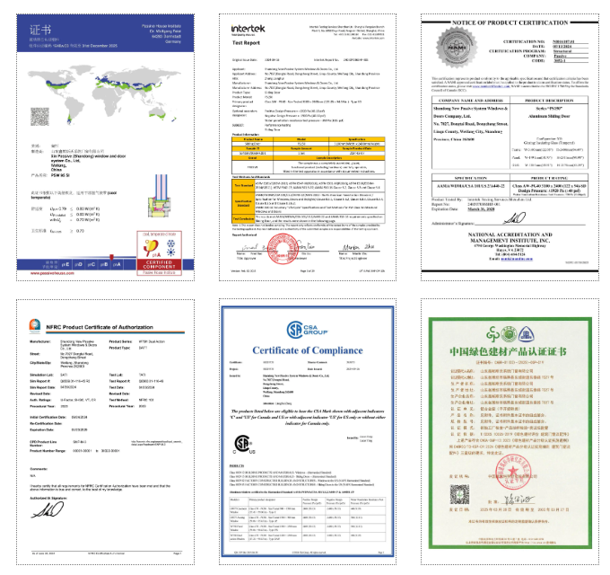 Passive has invested a lot of resources to establish advanced research and development laboratories, constantly breaking through the limits of product performance, and the core performance of the product far exceeds the industry average level. Several doors and windows products from Passive have successively obtained PHI-A certification NAMI、NFRC、CSA、 China's green building materials products have obtained multiple certifications, including three-star certification, and are sold well in many countries and regions such as China, Europe, and North America.